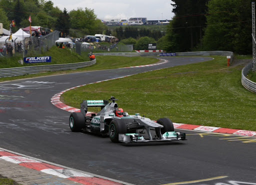Michael Schumacher drives a silver arrow around the Nurburgring.